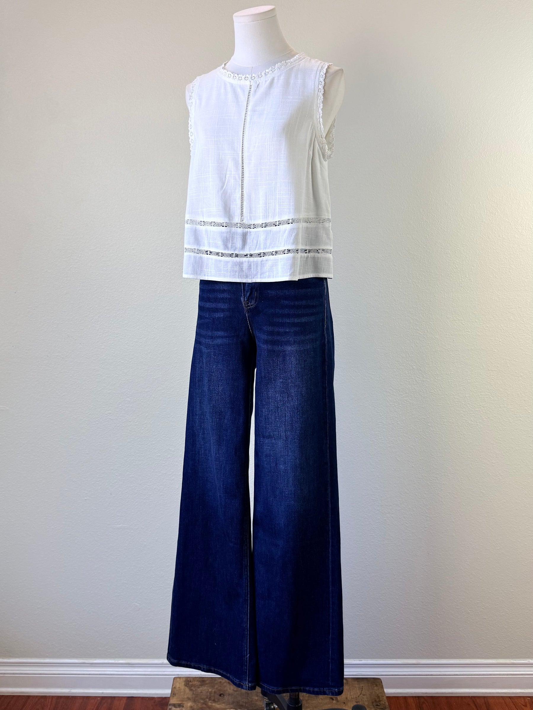 High rise full length wide jeans Comfort stretch denim, high rise waist, lightly distressed detail, full length, wide jeans F.